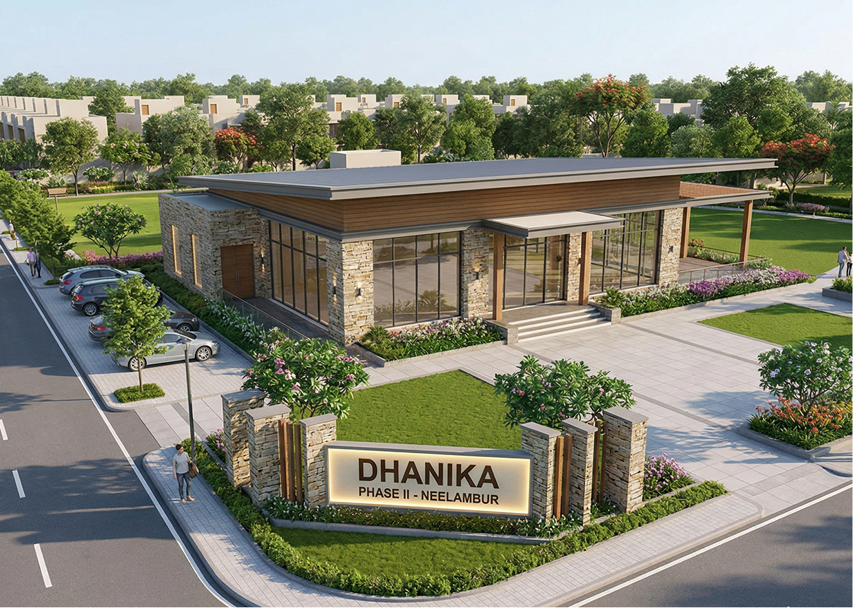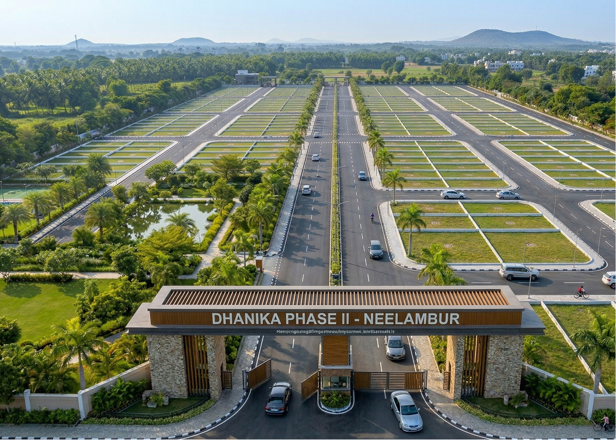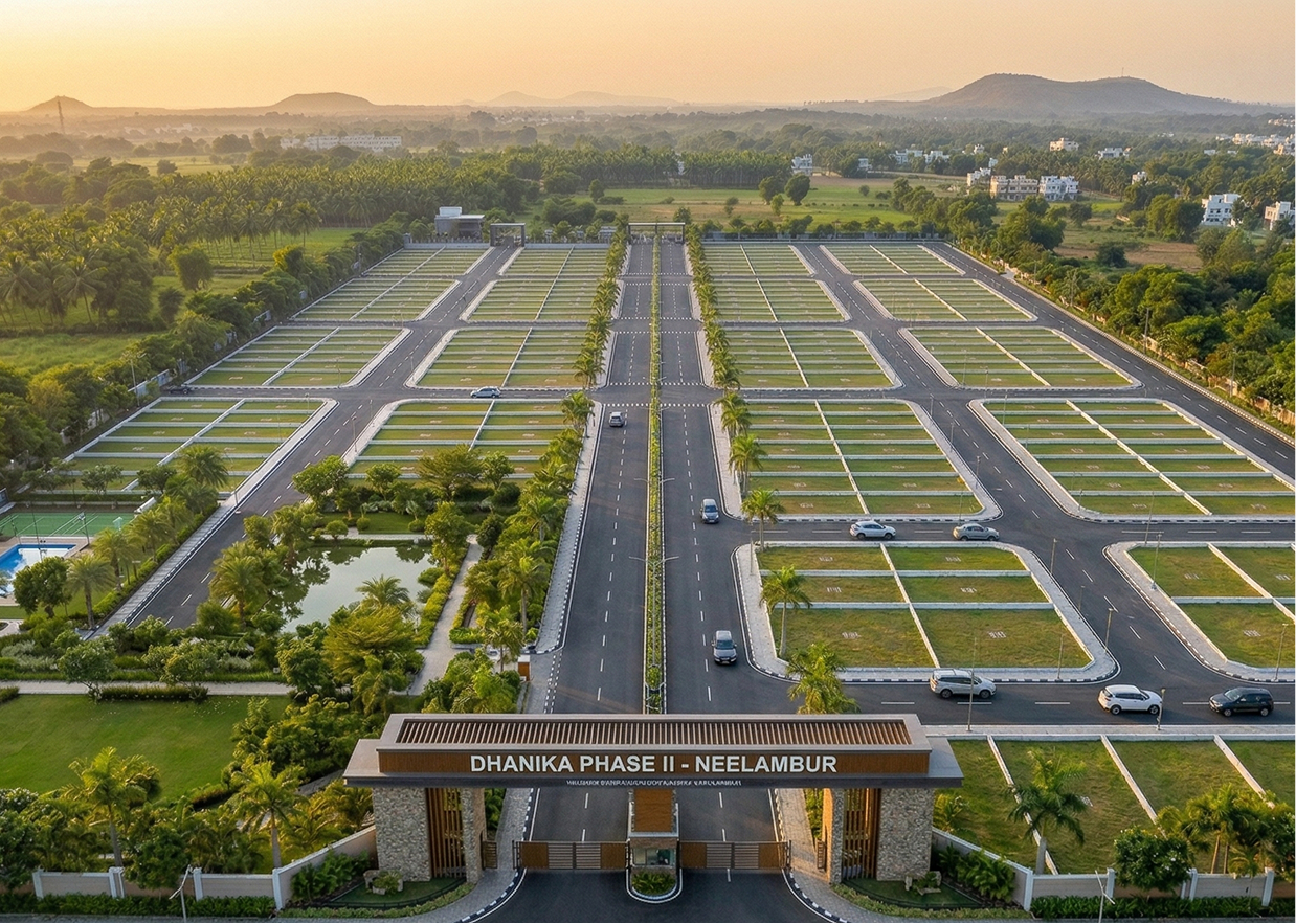 One of the fastest-growing residential areas close to Coimbatore is Neelambur, where Dhanika Phase II is a luxurious, high-end residential plotted development. The project, which spans 20 acres, offers a thoughtfully built residential neighbourhood that delivers the ideal fusion of modern living, convenience, and comfort. The project guarantees good access to the city while preserving a tranquil residential ambiance thanks to its strategic location just 1.5 km from NH47.